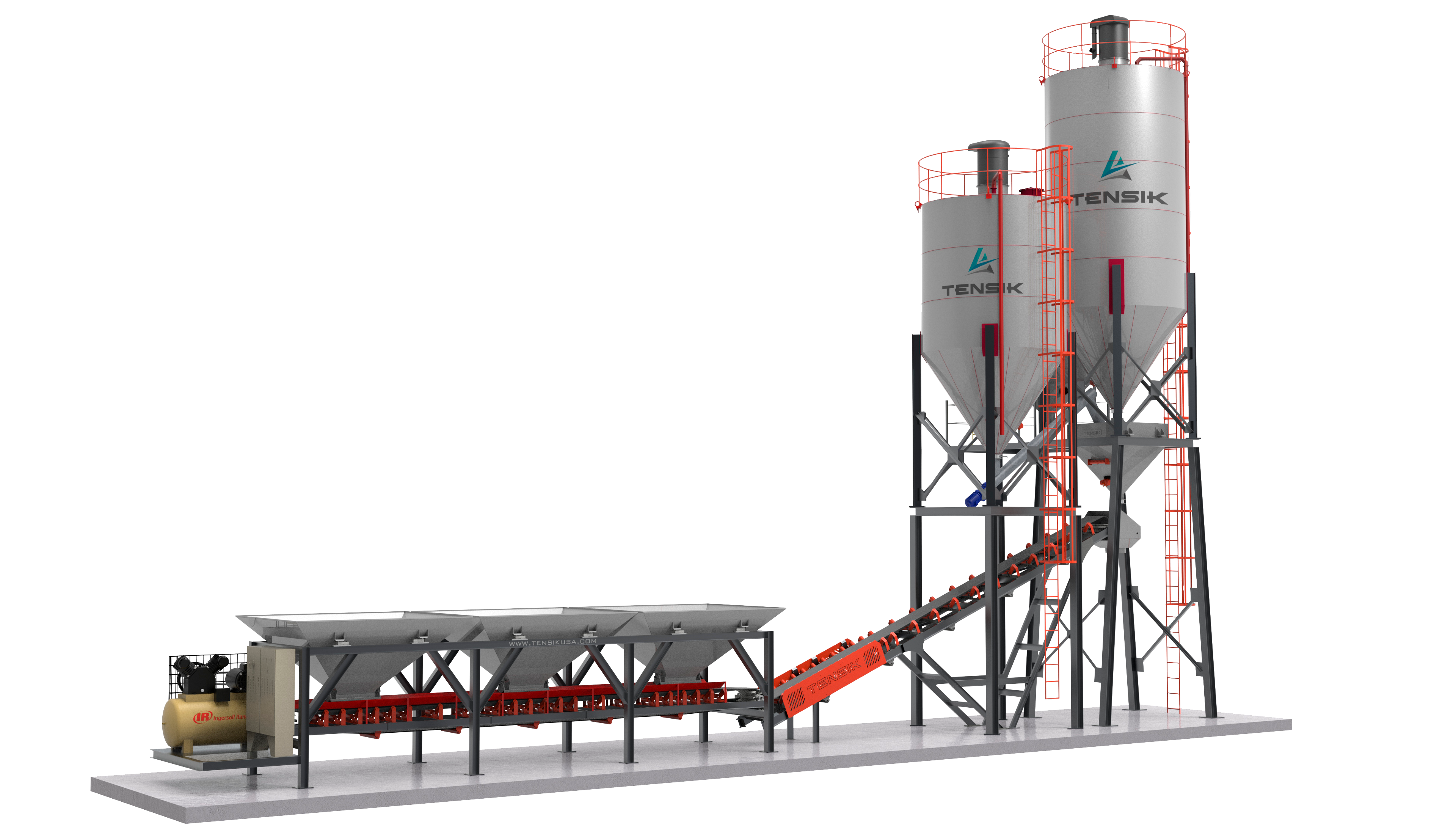 The TENSIK 100 system has a theoretical hourly production rate of 150-200 yd3/hr. It is designed for quick set-up and is movable with one truck . The system includes a 10 hp water pump, a 12 cubic yard aggregate batcher, and a surge tank with a capacity of 60 tons . It also features a weighted water system with a 3″ turbine type water meter, a water strainer, and a butterfly discharge valve with pneumatic actuator and solenoid valve . The system is equipped with a central lubrication panel and a self-erected hydraulic system.